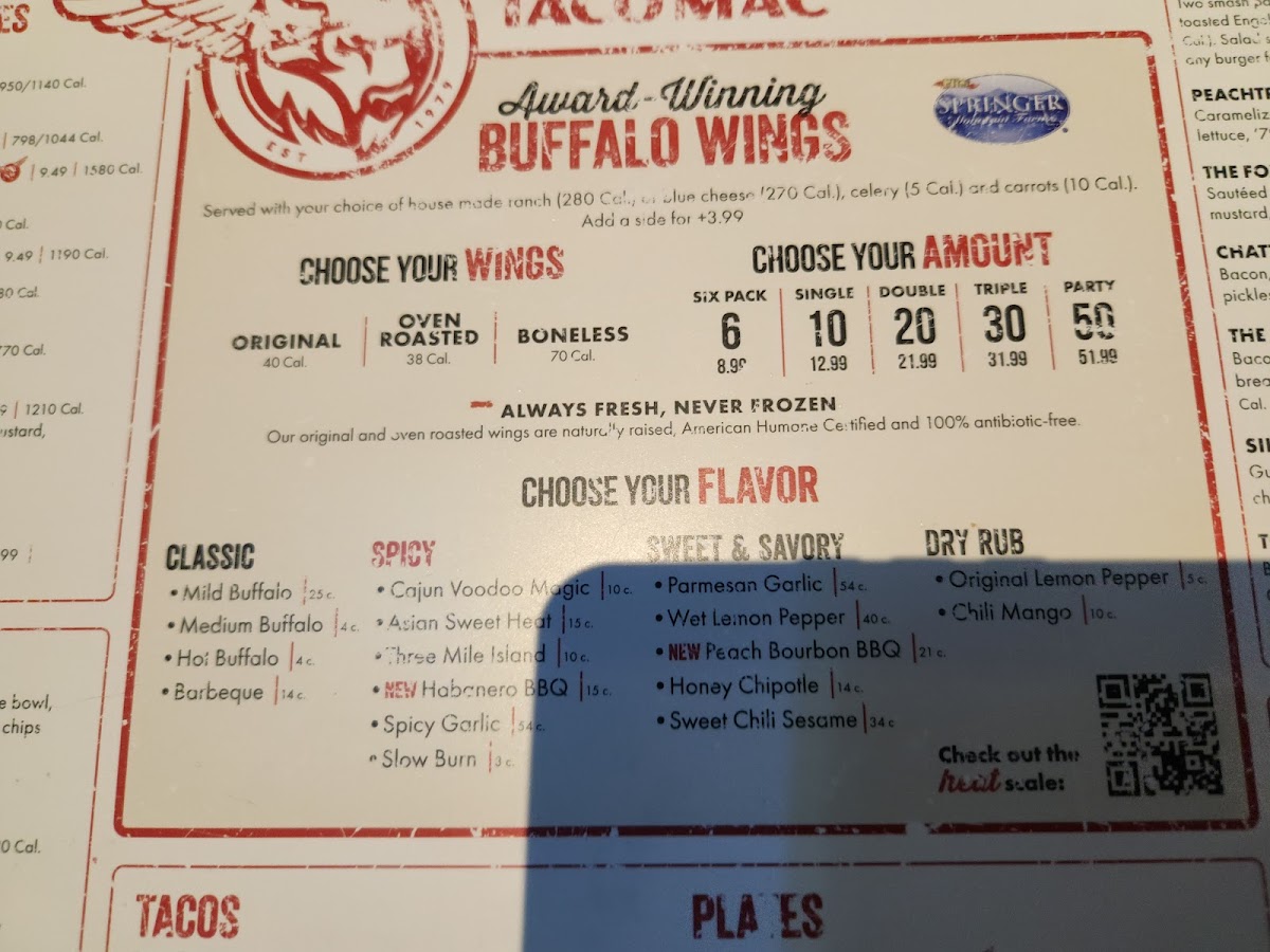 Taco Mac's Springer Mountain Farms wings are naturally raised, American Humane Certified and 100% antibiotic-free. The Southeast's Original Buffalo Wing paired with the Southeast's premier poultry farmer from the hills of North Georgia. Served with Carrots & Celery *Calorie increase for sauce is on a per-wing basis
